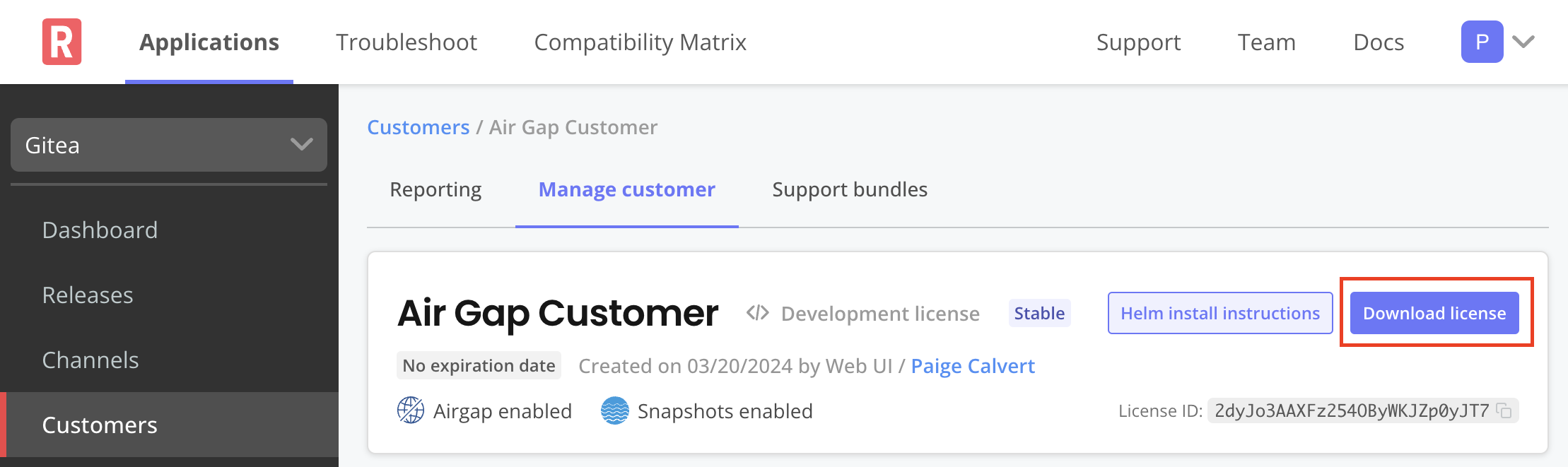 4. At the top of the screen, click Download license to download the air gap enabled license.