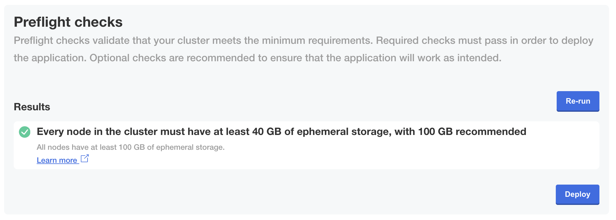 The following shows how a pass outcome for this preflight check is displayed in the Admin Console during KOTS installation or upgrade: